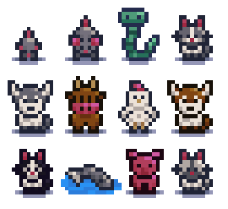 Each with: 4 Directions, idle animations and walking animations. (Except the fish)